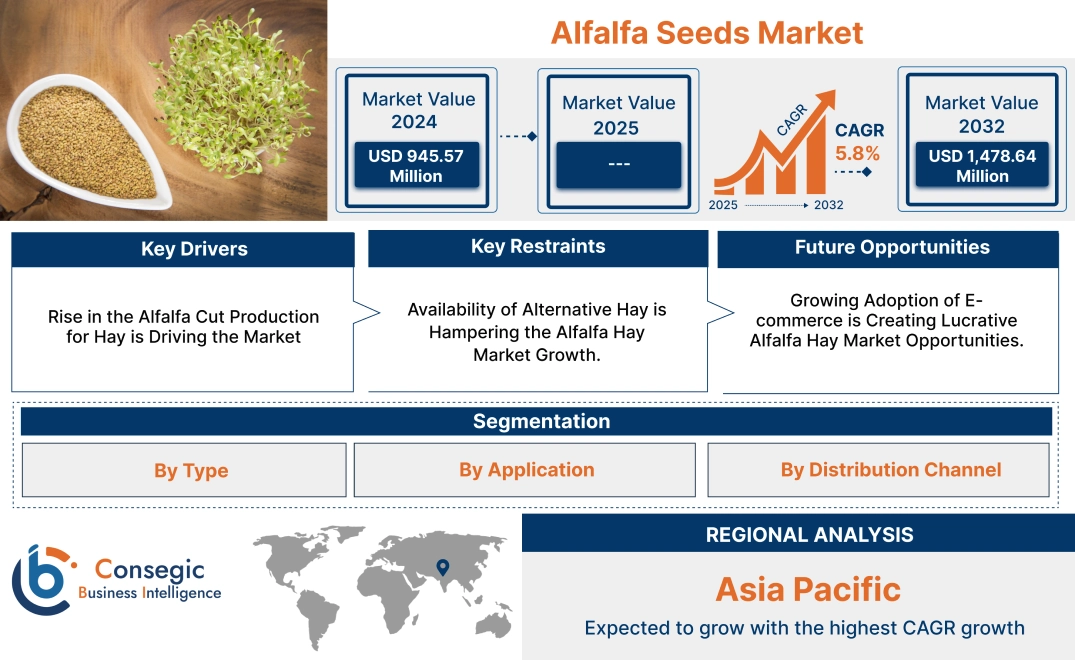 Alfalfa seeds market size is estimated to reach over USD 1,478.64 Million by 2032 from a value of USD 945.57 Million in 2024, growing at a CAGR of 5.8% from 2025 to 2032.