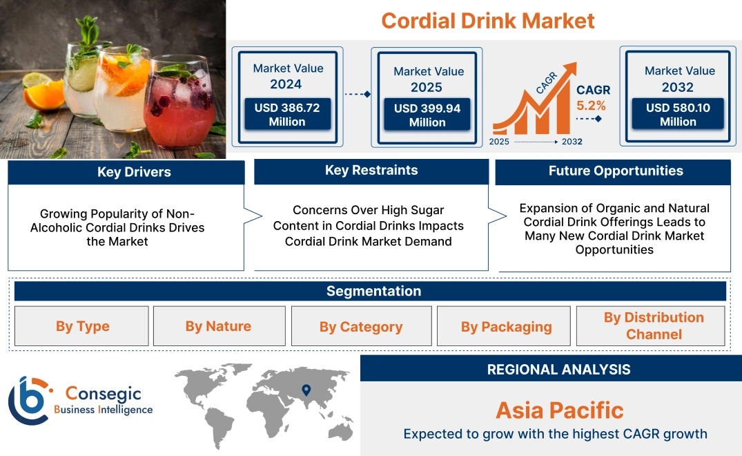 Cordial Drink Market size is estimated to reach over USD 580.10 Million by 2032 from a value of USD 386.72 Million in 2024 and is projected to grow by USD 399.94 Million in 2025, growing at a CAGR of 5.2% from 2025 to 2032.
