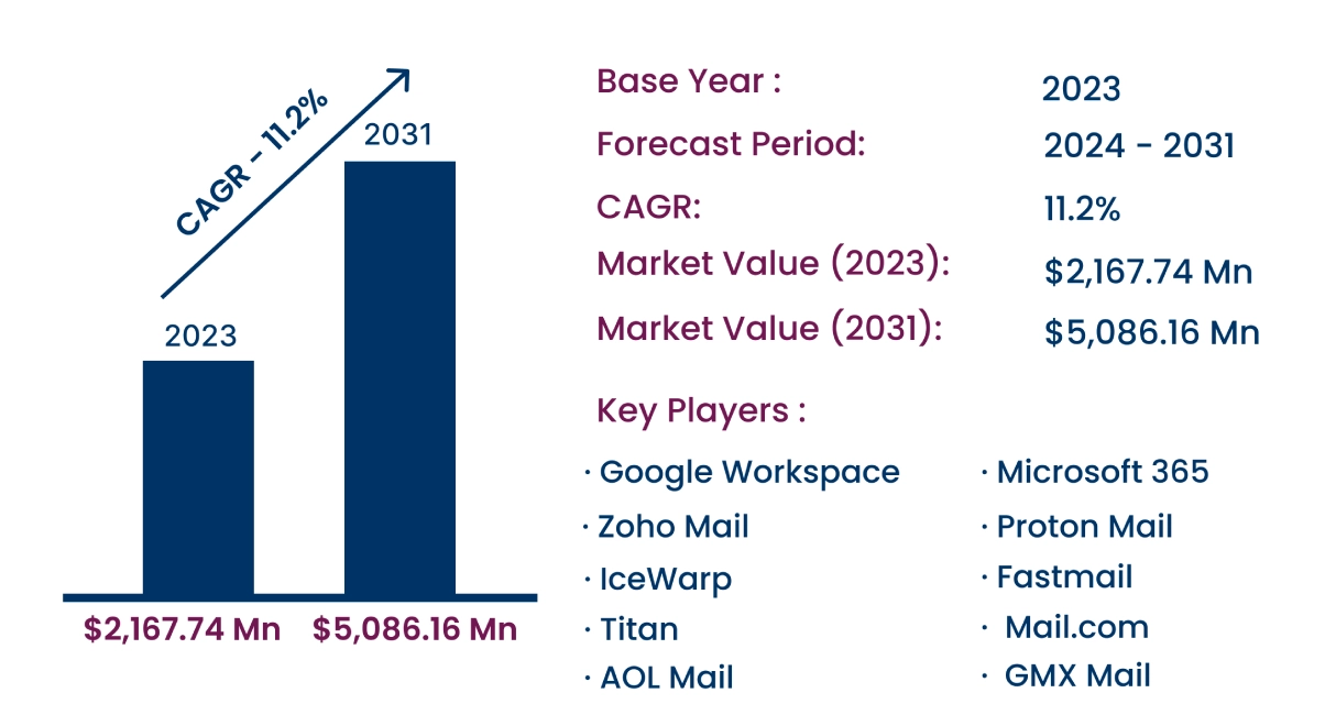 As per the Consegic Business Intelligence newly published report, the Cloud Business Email Market size was valued at USD 2,167.74 million in 2023 and is projected to grow at a CAGR of 11.2% during the forecast period, reaching USD 5,086.16 million by 2031. Cloud business email solutions provide businesses with secure, scalable, and efficient communication platforms hosted on cloud infrastructure. These solutions include essential features such as spam filtering, secure hosting, data backup, and integration with productivity tools. Key end-users include SMEs, large enterprises, and public sector organizations.