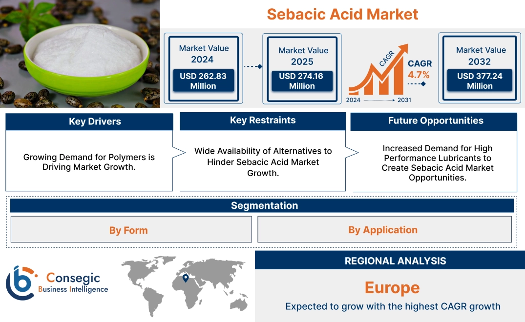 The Sebacic Acid Market size is growing with a CAGR of 4.7% during the forecast period (2025-2032), and the market is projected to be valued at USD 377.24 Million by 2032 from USD 262.83 Million in 2024. Additionally, the market value for 2025 is attributed to USD 274.16 Million.