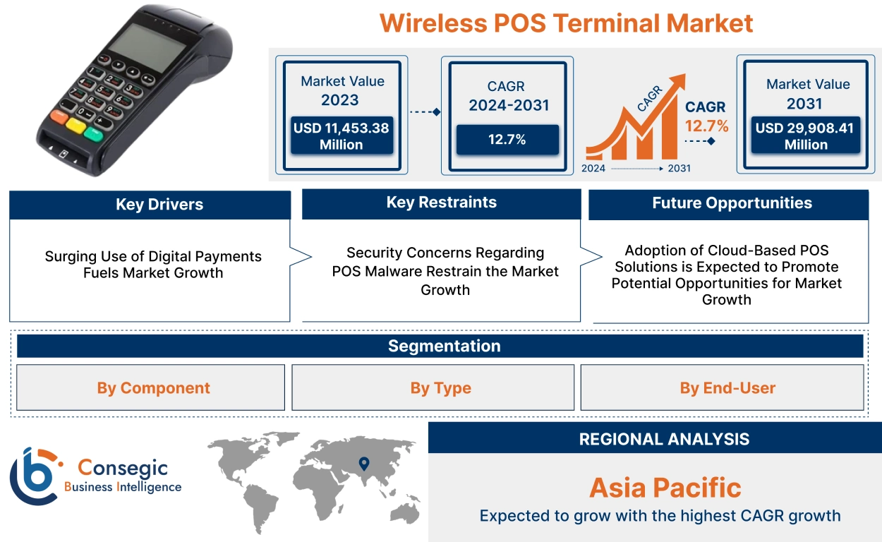 Wireless POS Terminal Market size is estimated to reach over USD 29,908.41 Million by 2031 from a value of USD 11,453.38 Million in 2023 and is projected to grow by USD 12,709.36 Million in 2024, growing at a CAGR of 12.7% from 2024 to 2031.